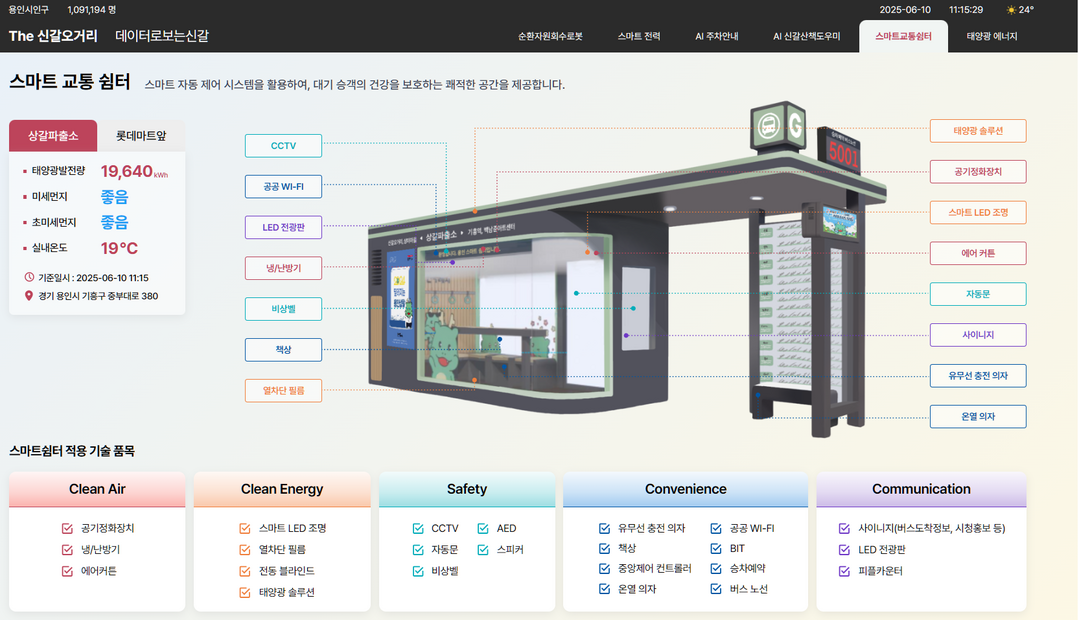 신갈오거리에 설치된 △순환자원회수로봇 △스마트교통쉼터 △태양광에너지 △AI 주차안내 △AI 신갈산책도우미(걸어용) △스마트전력 등의 장비에서 수집한 스마트 도시재생 데이터를 시각화해 공개했다.