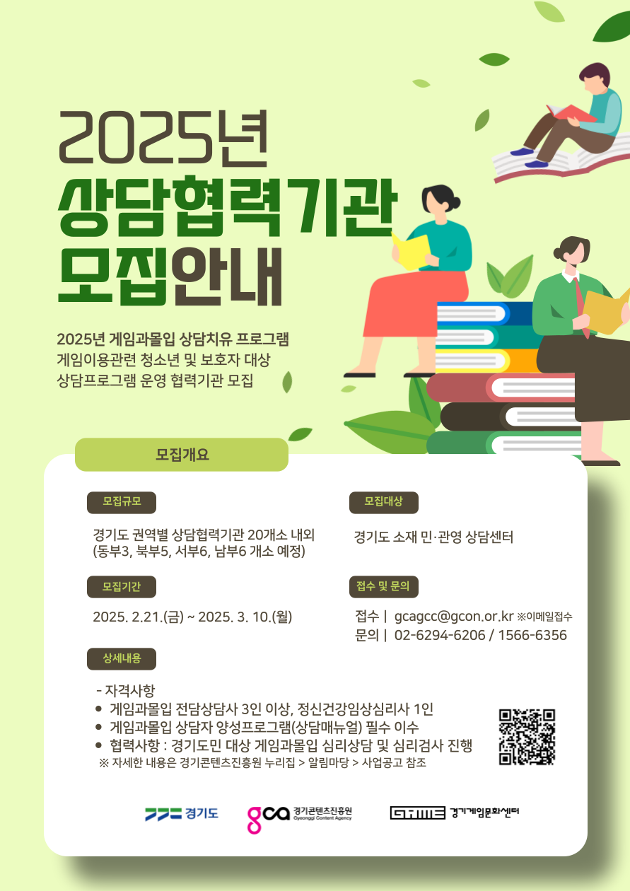 경기게임문화센터는 다음 달 10일까지 경기도 내 상담 전문기관을 대상으로 '2025년 게임과몰입 상담치유 프로그램' 상담 협력기관을 모집한다고 26일 밝혔다. 경기게임문화센터는 경기콘텐츠진흥원에서 운영 중이다.