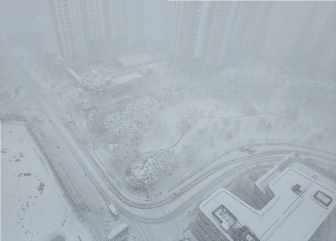 | ▲ 폭설에 뒤덮인 경기도청 앞 도로와 아파트 단지 전경. [진현권 기자] |