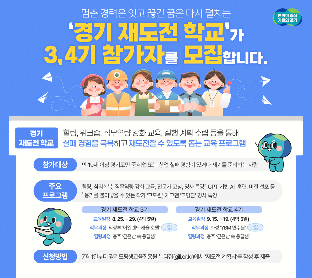 '경기 재도전학교'는 취·창업 실패 경험을 극복하고 재도전할 수 있도록 돕는 교육 프로그램이다. 참가자는 힐링 워크숍, 직무 역량 강화 교육, 실행계획 수립을 통해 자기 회복과 실천 능력을 키우게 된다.