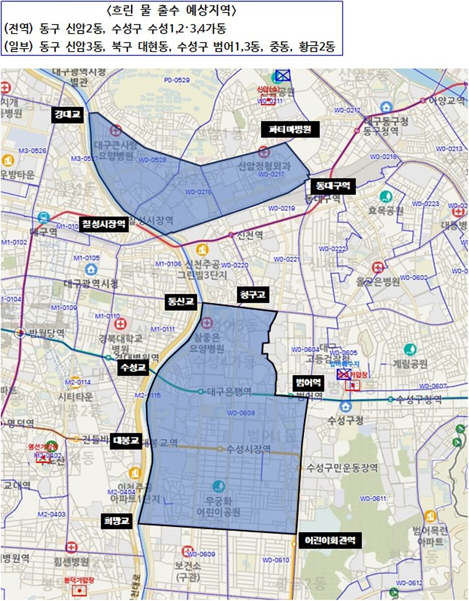 | ▲ 흐린 수돗물이 나올 수 있는 지역 위치도. [대구시 제공] |