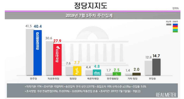 한편 더불어민주당 지지율은 40.4%로 전주 대비 1.1%p 하락했으나 40%대를 유지했고, 자유한국당 지지율은 2.7%p하락한 27.9%로 4개월여 만에 최저치를 기록했다.