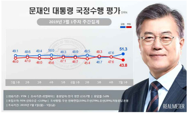 리얼미터가 YTN 의뢰로 1~5일 전국 유권자 2517명을 상대로 조사해 8일 발표한 여론조사 결과, 전체 응답자의 51.3%가 문 대통령이 국정수행을 잘하고 있다고 응답했다.
