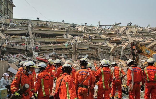 ▲ 미얀마 만달레이에서 구조대원들이 지진으로 무너진 건물을 수색하고 있다. 미얀마 군사정권은 지난 28일 발생한 규모 7.7의 강진으로 인한 사망자 수가 약 1700명이고 부상자는 3400명에 달한다고 밝혔다. [AP/뉴시스]