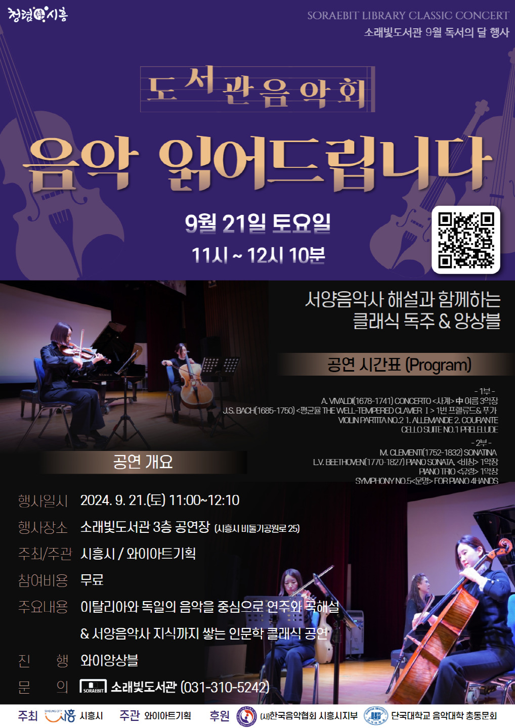 '음악 읽어드립니다' 공연은 시흥시가 올해 문화예술단체 발전사업의 하나로 지원하고, 와이아트기획에서 주관하는 공연이다. 지난 7월 목감도서관, 8월 장곡도서관의 공연에서 시민들의 뜨거운 호응을 얻었다.