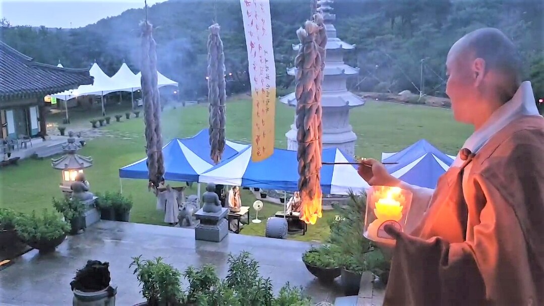 ▲ 낙화봉에 점화하고 있는 세종 영평사 스님.[세종시 제공]