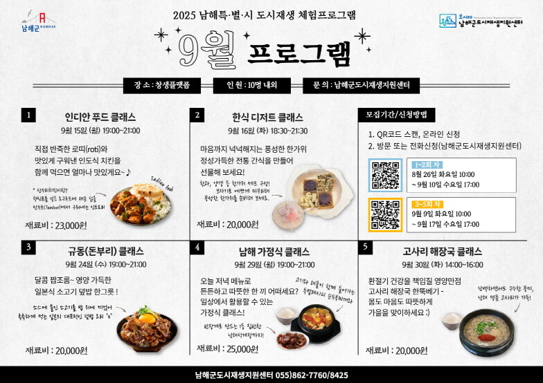 9월 프로그램은 △인디안 푸드 클래스(15일) △한식 디저트 클래스(16일) △규동(돈부리) 클래스 (24일) △남해 가정식 클래스(29일) △고사리 해장국 클래스(30일) 등 총 5개 과정이다.