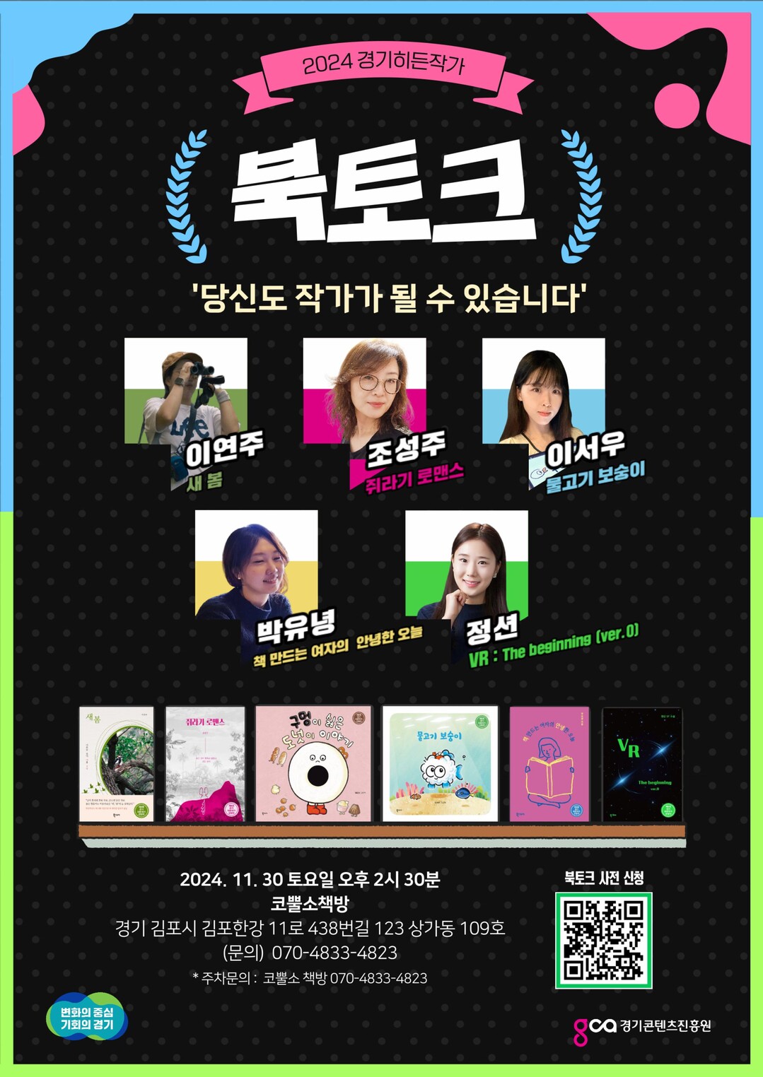 '당신도 작가가 될 수 있습니다'를 주제로 하는 이번 북토크에는 2024년 경기히든작가 선정 작가 중 5명을 초청한다.