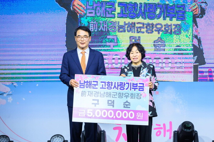 지난 18일 남해 충렬사 광장에서 열린 '꽃 피는 남해' 개막식에서 구덕순 전 재경남해군향우회장이 3년 연속 500만원의 고향사랑기부금을 남해군에 기탁했다.