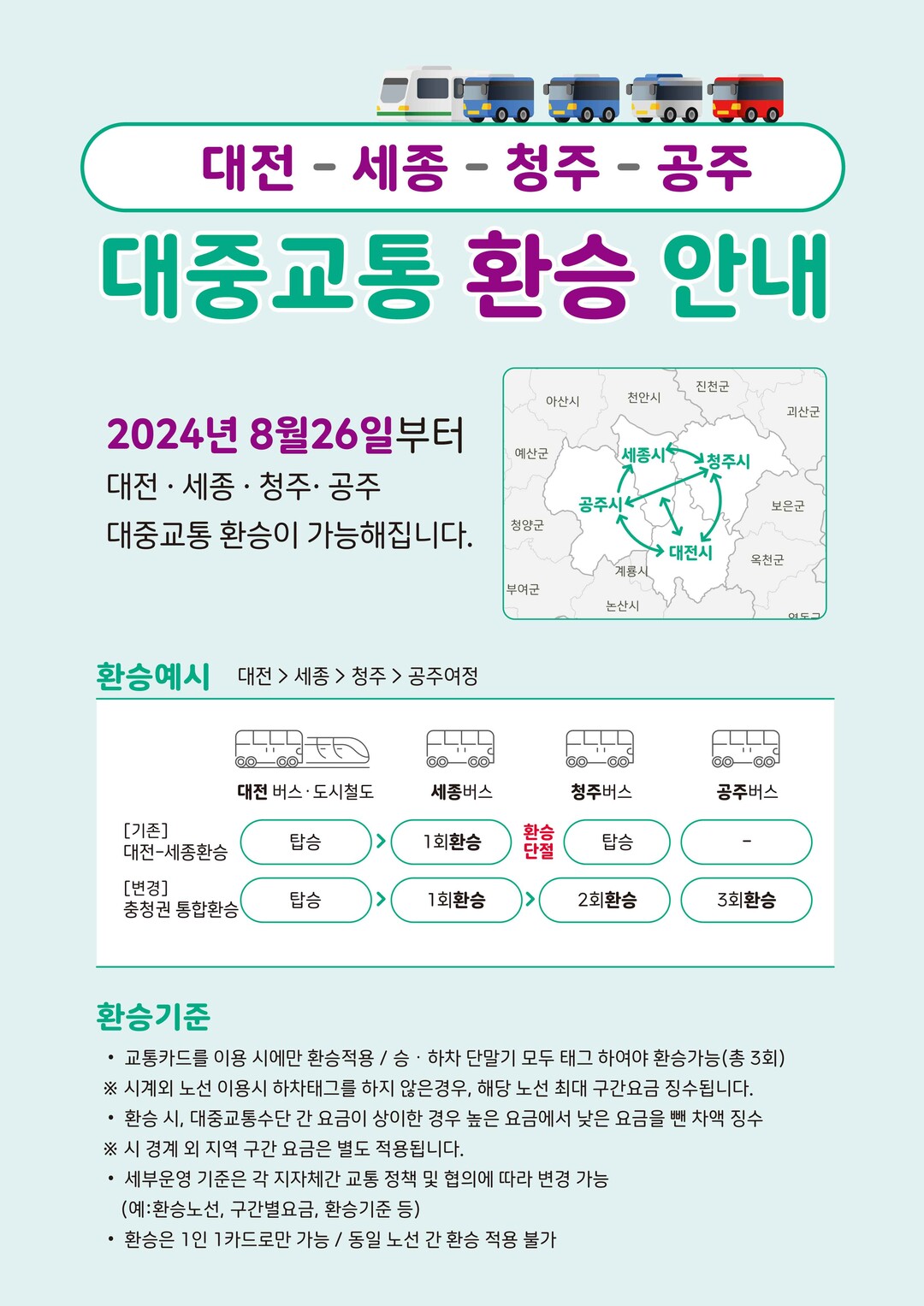 그동안 세종이나 대전에서 청주, 공주로 이동하려면 교통비를 추가로 부담해야 했으나, 앞으로는 BRT(간선급행버스체계), 시내버스, 도시철도 등을 이용하면 3회까지 환승할 수 있다.
