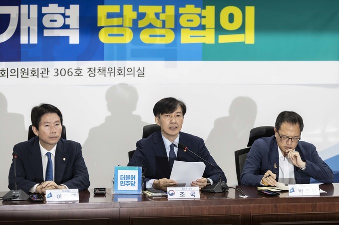 조 장관은 "검찰개혁은 지체할 수 없는 시대적 과제"라며 "패스트트랙(신속처리안건) 법안이 20대 국회에서 입법될 수 있도록 당 차원의 협조를 의심치 않는다"며 "법 통과 전이라도 시행령, 규칙 개선 등 법무부가 할 수 있는 개혁과제를 찾아 신속히 추진하겠다"고 말했다.
