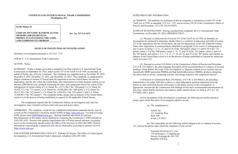| ▲ 미 국제무역위원회(ITC)가 2025년 12월 29일 발행한 조사 개시 통지서(사건 번호 337-TA-1472). 넷리스트의 소 제기에 따라 삼성전자 등의 DRAM 제품에 대한 관세법 337조 위반 여부 조사를 공식화하는 내용을 담고 있다. [ITC 제공] |