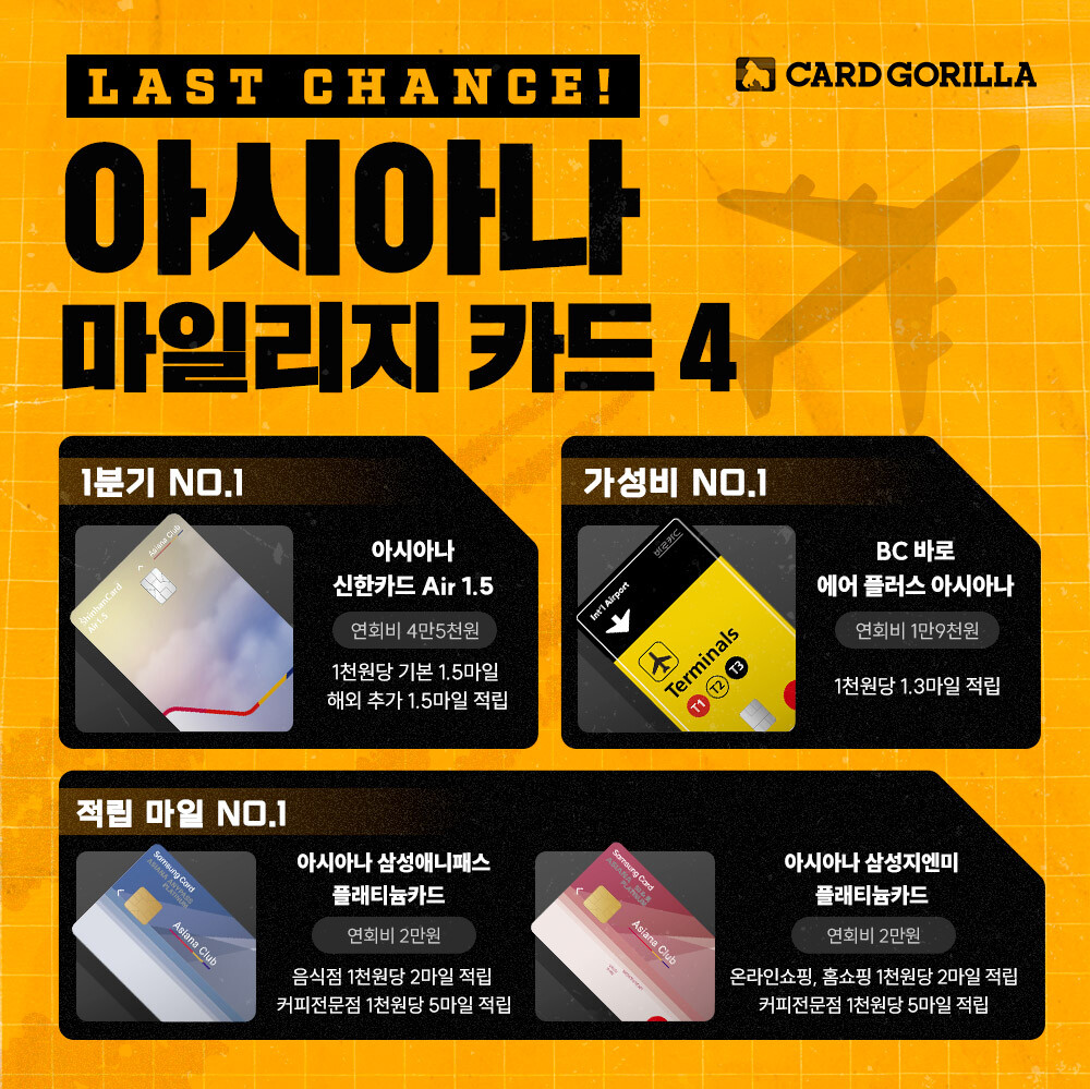 국내 최대 신용카드 플랫폼 카드고릴라가 단종 전 챙겨야 할 '아시아나 마일리지 카드' 4종을 11일 공개했다.