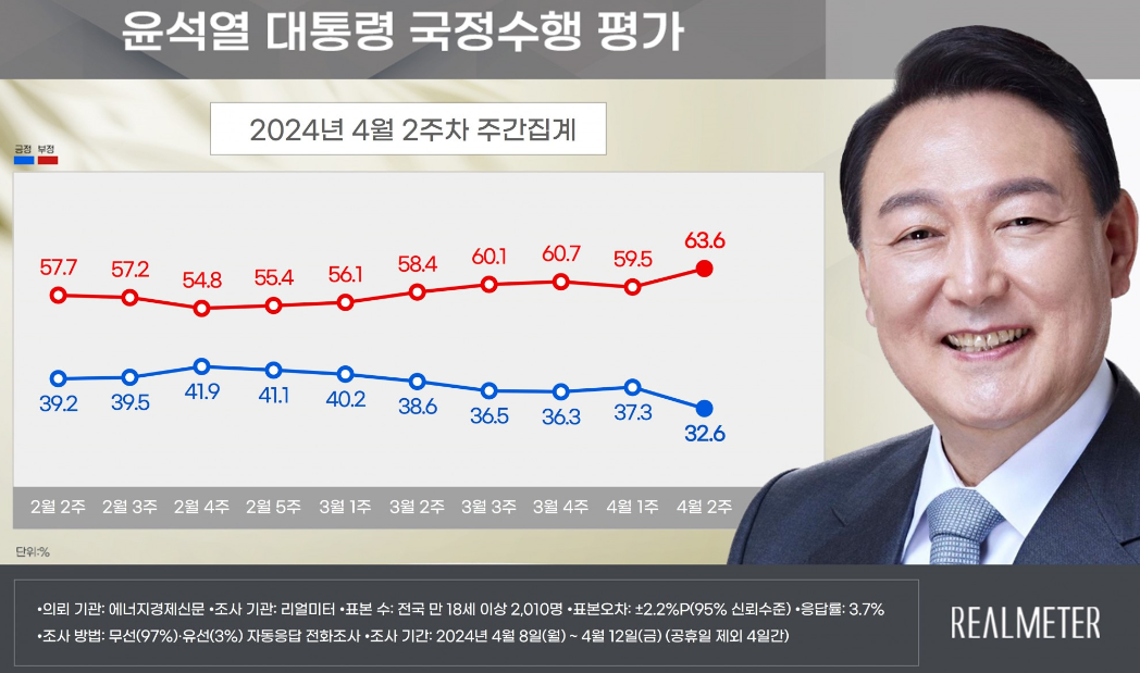 최홍태 리얼미터 선임연구원은 "국민의힘의 총선 패배에 따른 '용산 책임론'이 불거지며 윤 대통령의 지지율은 주 후반 이틀 연이은 급락세를 보였다"고 분석했다.