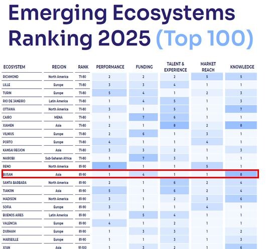 이번 평가 순위는 환동해안권역 도시인 일본 후쿠오카(90위권)에 앞서는 것으로, 부산의 환동해안권 창업 선도 도시로서의 입지가 재확인됐다.