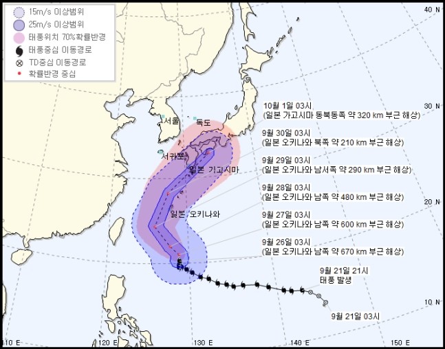 이런 예상경로에 따르면 제주 등이 태풍의 영향권에 들 가능성이 있다. 현재 한반도 상공에는 북쪽에서 내려온 찬 고기압이 자리잡고 있어 이 고기압의 움직임이 변수가 될 전망이다.