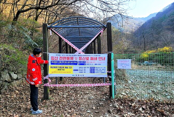 | ▲ 지난 1일 입산 전면통제 및 등산로 폐쇄를 알리는 현수막이 붙어있는 모습 [창원시 제공] |