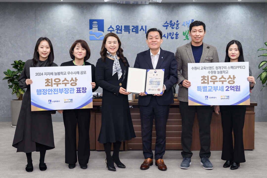 | ▲ 지난달 9일 행정안전부가 발표한 '지방자치단체 늘봄학교 연계‧협력 우수사례 공모전'에서 최우수상을 수상한 이재준 수원시장(왼쪽 네번째)을 비롯한 관계자들이 기념촬영을 하고 있다. [수원시 제공] |