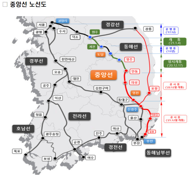 이번 개통으로 청량리에서 시작해 원주~제천~단양~영주~안동~경주~태화강(울산)~부전(부산)의 모든 구간에 KTX가 다니는 국토 종단의 간선축이 마련됐다.