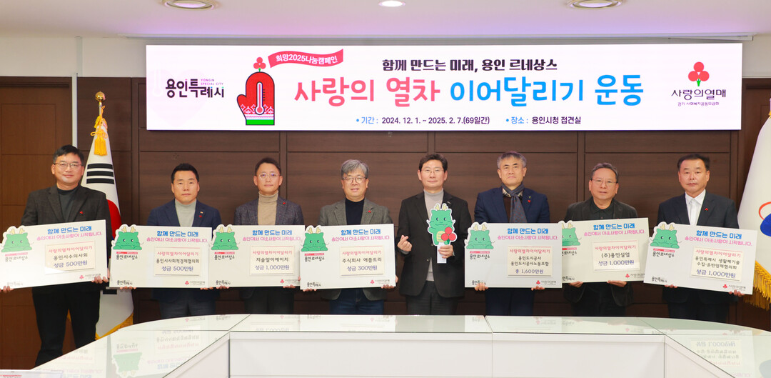전달식 참여 기관은 △용인도시공사&용인도시공사노동조합(성금 1600만 원) △용인실업(성금 1000만 원) △용인시 생활폐기물 수집·운반업체협의회(성금 1000만 원) △지솔알이에이치(성금 1000만 원) △용인시사회적경제협의회(성금 500만 원) △용인시수의사회(성금 500만 원) △주식회사 애플트리(성금 300만 원) 등이다.
