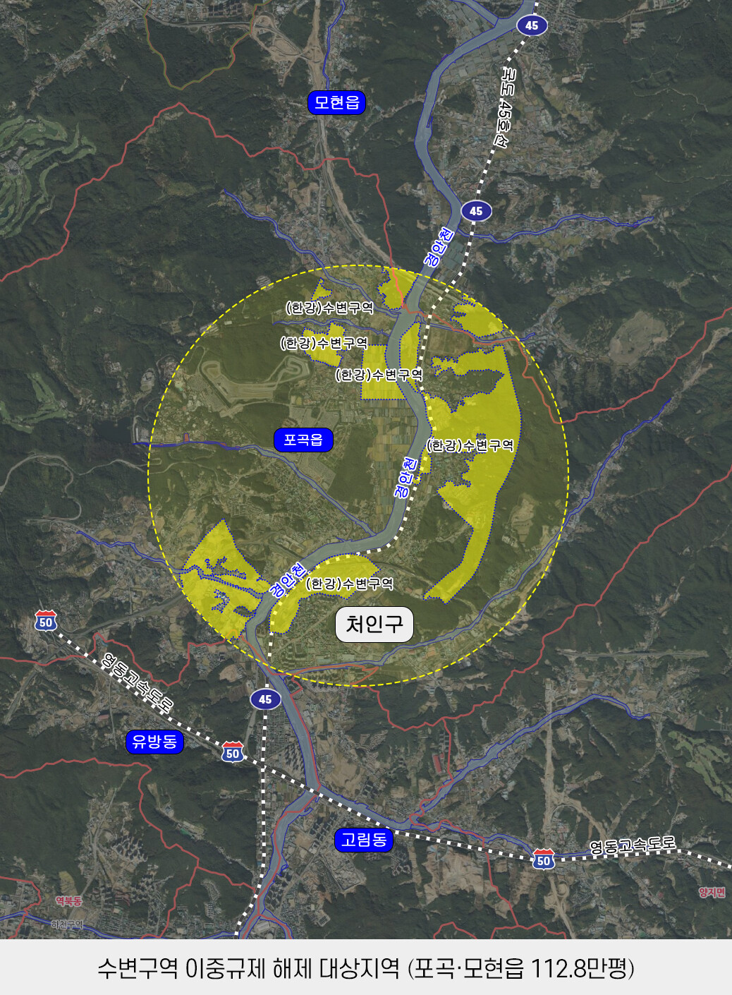 해제 규역 중 수변구역 3.728㎢은 '한강수계법'의 수변구역과 '군사기지 및 군사시설 보호법'의 군사시설 보호구역으로 중복 지정돼 이중 규제를 받던 포곡읍 삼계리·금어리·둔전리·신원리·영문리·유운리, 모현읍 초부리, 유방동 일부 등 3.65㎢와 하천 경계로부터 거리 산정(경안천 양안 1㎞ 이내) 오류로 지정된 유방동의 0.078㎢이다.