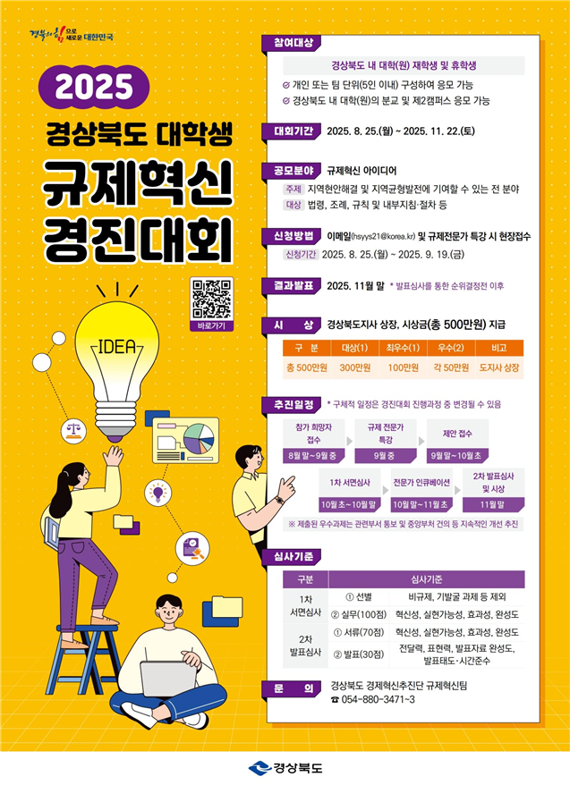 경북도는 경북도내 대학(원) 재학생과 휴학생을 대상으로 25일부터 오는 11월 22일까지 '2025 경상북도 대학생 규제혁신 경진대회'를 진행한다.