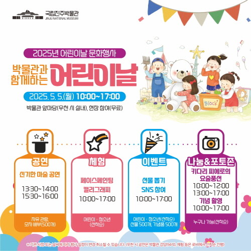 국립진주박물관(관장 장용준)은 제103회 어린이날을 맞아 5월 5일 오전 10시부터 박물관 앞마당에서 '박물관과 함께하는 어린이날' 행사를 갖는다고 25일 밝혔다.