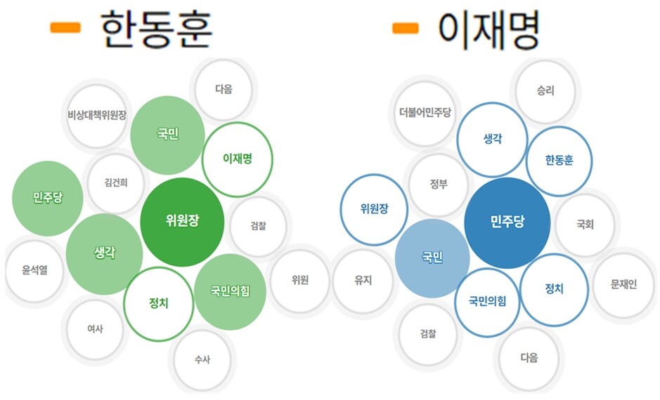 한 위원장에 대한 빅데이터 연관어는 '위원장', '국민', '국민의힘', '민주당', '이재명', '정치', '비상대책위원장', '위원', '윤석열', '수사', '김건희', '검찰', '여사' 등으로 나왔다. 이 대표에 대한 빅데이터 연관어는 '민주당', '국민', '정치', '위원장', '한동훈', '국민의힘', '더불어민주당', '문재인', '유지', '승리', '정부', '국회', '검찰' 등으로 나타났다.