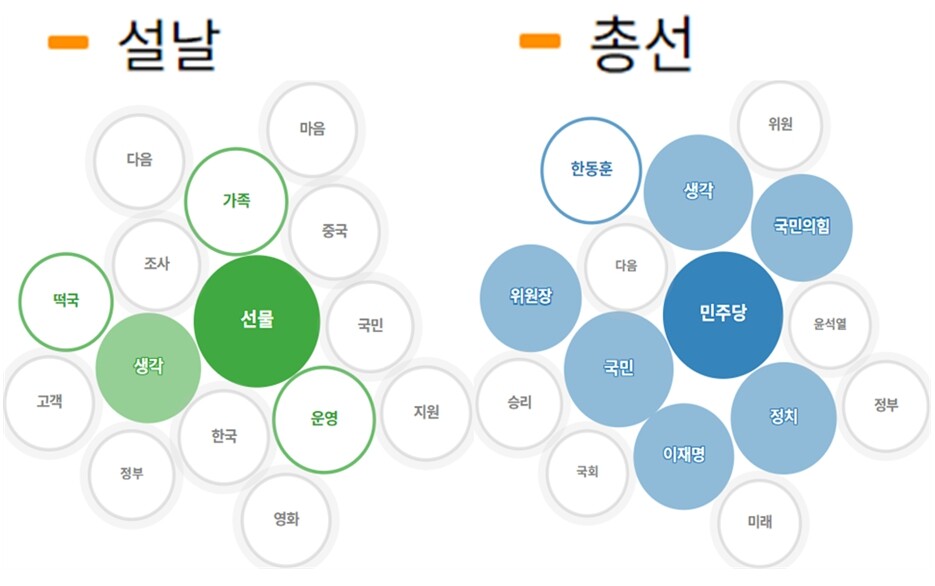 설날에 대한 빅데이터 연관어는 '선물', '가족', '운영', '떡국', '중국', '한국', '지원', '고객', '마음', '영화', '조사', '국민', '정부' 등으로 나왔다. 총선에 대한 빅데이터 연관어는 '민주당', '국민', '정치', '위원장', '국민의힘', '이재명', '한동훈', '정부', '승리', '위원', '미래', '윤석열', '국회' 등으로 나타났다.