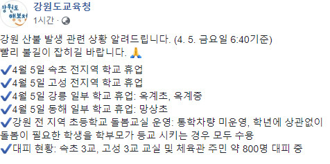 ▲ 강원도교육청이 5일 산불 피해 지역 학교를 휴업하기로 했다. [강원도교육청 페이스북 캡처]