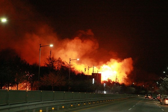 ▲ 지난 4일 오후 11시 46분께 강원 속초시 속초IC 인근 야산에서 발생한 산불이 장천마을 일대로 번지고 있다. [뉴시스]