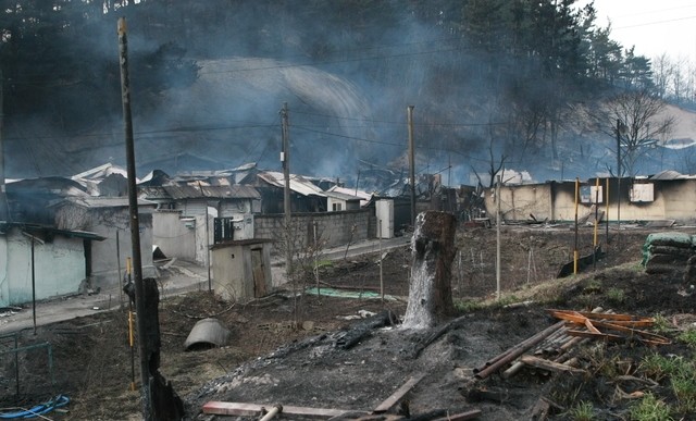▲ 지난 4일 오후 강원 고성에서 발생한 산불이 번져 다음날 새벽까지 확산한 가운데 속초시 영랑호 인근 마을이 피해를 입었다. [뉴시스]