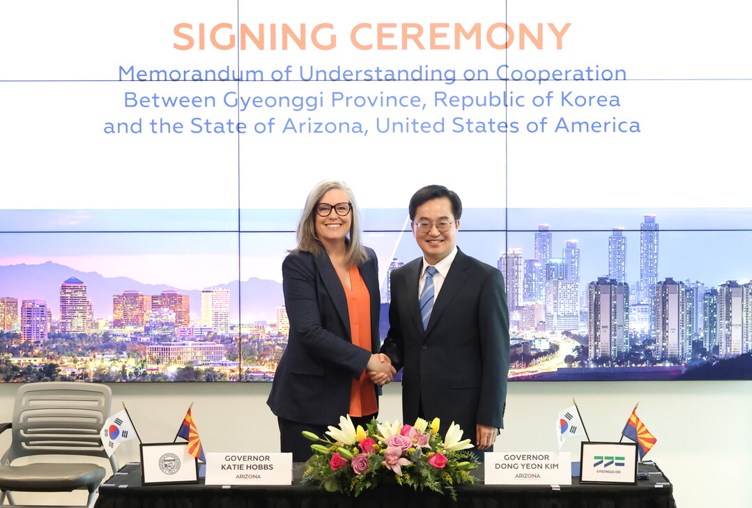 ▲ 지난 5월 14일 미 매리조나주 케이티 홉스(Katie+Hobbs) 주지사와 기념촬영하는 김동연 지사.  [경기도 제공]