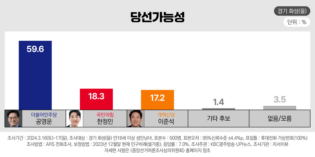 이번 여론조사는 지난 16, 17일 화성을에 거주하는 만 18세 이상 성인 500명을 대상으로 실시했다. 휴대전화 가상번호를 활용한 무선전화 자동응답(ARS) 방식으로 진행됐고 응답률은 7.0%다.