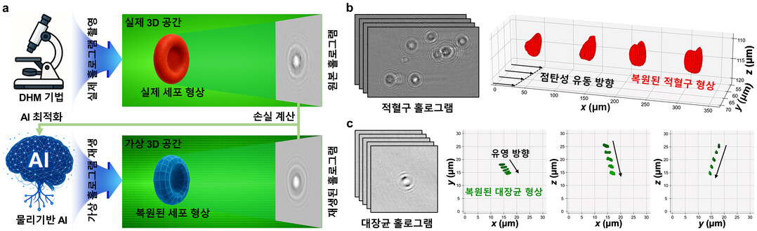 연구팀은 '디지털 홀로그래픽 현미경(DHM)'과 AI(인공지능)를 결합해 단 한 장의 영상으로 세포의 3차원 모습과 위치, 빛이 세포를 통과하면서 굴절되는 정도까지 한꺼번에 파악할 수 있는 기술을 개발했다.