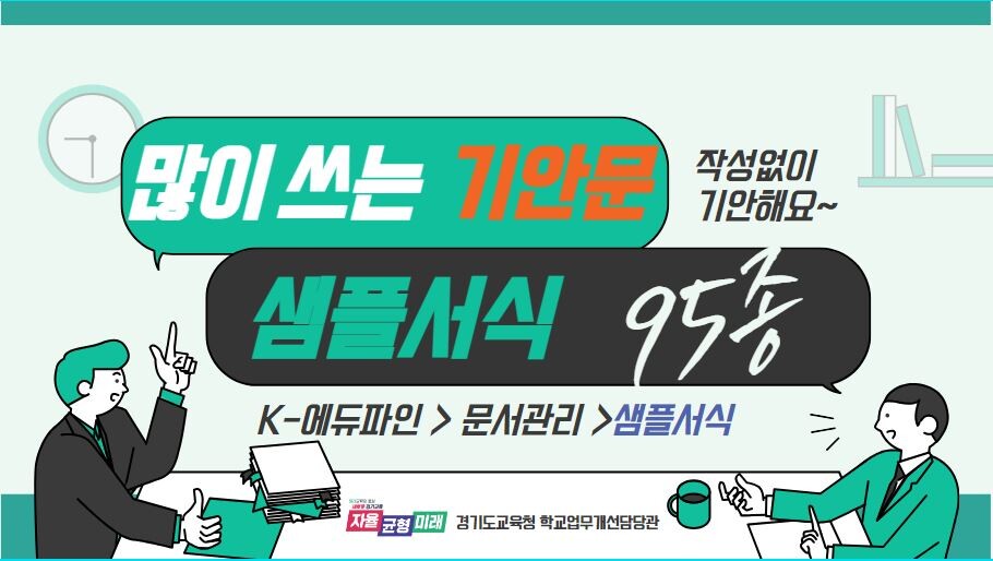 경기도교육청은 교직원의 공문서 작성 부담 경감과 효율성은 낮추기 위해 12개 영역 95종 기안문 예시 자료와 공문서 작성, K-에듀파인 활용 안내자료를 개발했다고 16일 밝혔다.