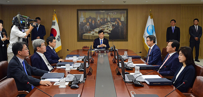 이주열 한국은행 총재가 18일 서울 중구 한국은행에서 금융통화위원회 본회의를 위해 자리에 앉아있다.