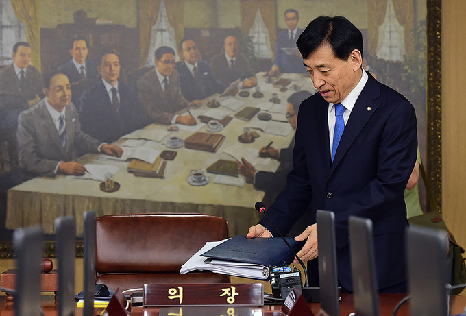 이주열 한국은행 총재가 18일 서울 중구 한국은행에서 열린 금융통화위원회 본회의에 참석하고 있다.