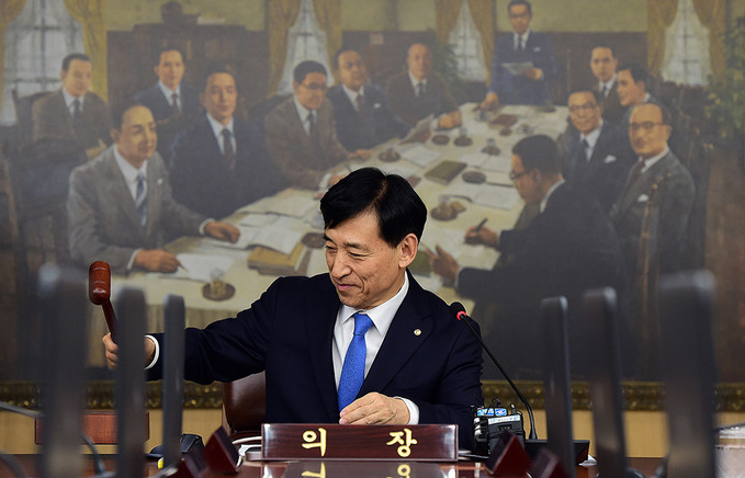 이주열 한국은행 총재가 18일 서울 중구 한국은행에서 금융통화위원회 진행을 위해 의사봉을 두드리고 있다.