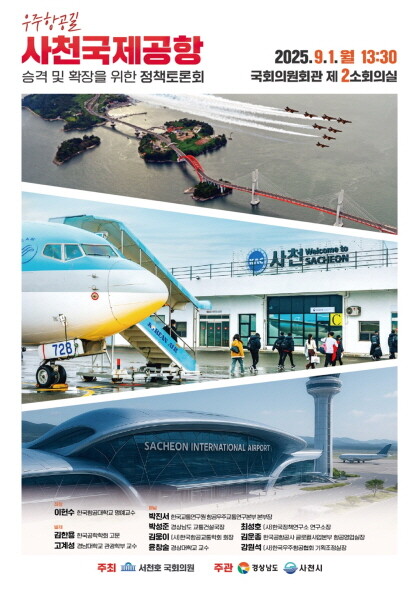 행사는 서천호 국회의원의 개회사를 시작으로 박명균 도 행정부지사와 박동식 사천시장의 환영사, 국회의원들의 축사가 이어진다. 주제 발표에는 김한용 한국공학학회 고문과 고계성 경남대학교 관광학부 교수가 참여해 사천국제공항 승격의 필요성과 기대효과를 발표한다.