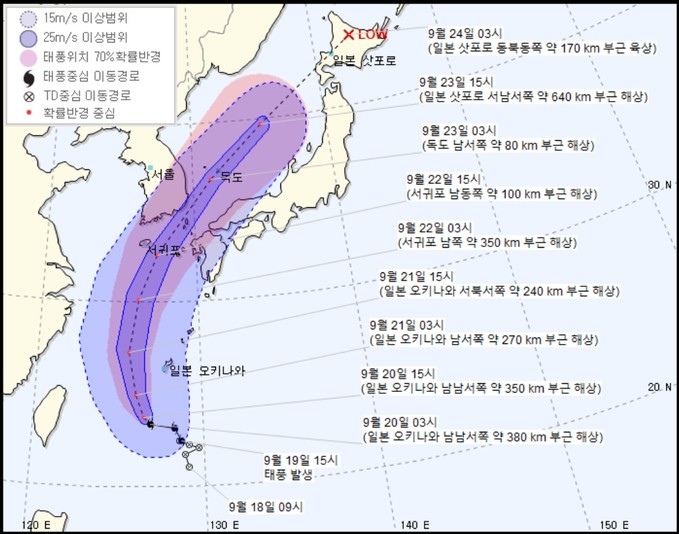 예상되는 강수량은 월요일인 23일까지 제주 산간에 최고 500mm 이상, 영동과 영남, 전남에도 많게는 300mm 이상으로 특히 제주와 남해안, 동해안에 비가 집중되겠다.