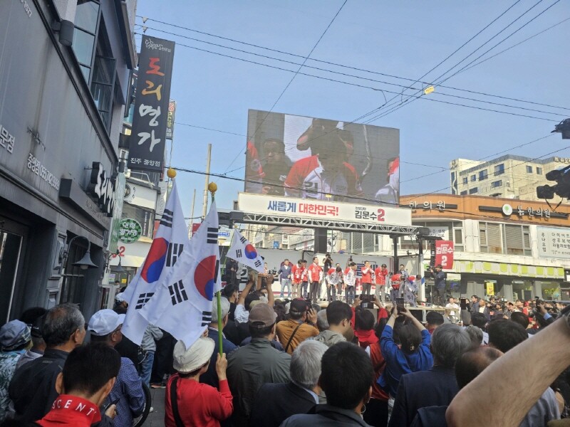 | ▲ 14일 진주 광미사거리에서 김문수 후보가 유세를 하고 있다. [박종운 기자] |