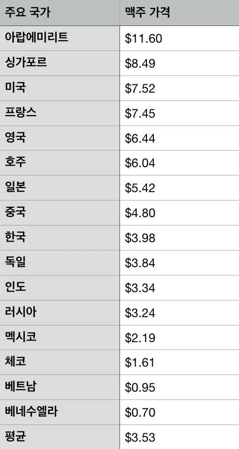 맥주 가격이 가장 비싼 나라는 아랍에미리트로 11.6달러였으며, 가장 싼 국가는 베네수엘라로 0.7달러였다.