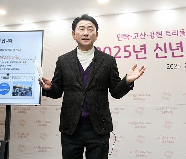 | ▲김동근 의정부시장이 4일 신년기자회견에서 트리플 업그레이드 프로젝트를 발표하고 있다. [의정부시 제공] |