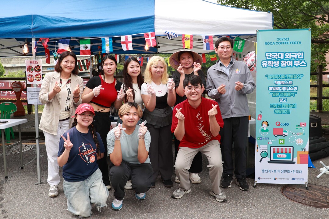 | ▲ 축제에 참여한 단국대 외국인 유학생들이 이상일(오른쪽) 시장과 기념촬영을 하고 있다. [용인시 제공] |