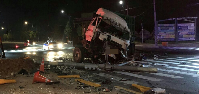 ▲ 18일 오전 1시 19분께 충남 아산시 음봉면 산동사거리에서 직진하던 45인승 버스와 좌회전하던 27t 화물차량이 충돌했다. 사진은 충돌로 인해 파손된 화물차 [뉴시스]