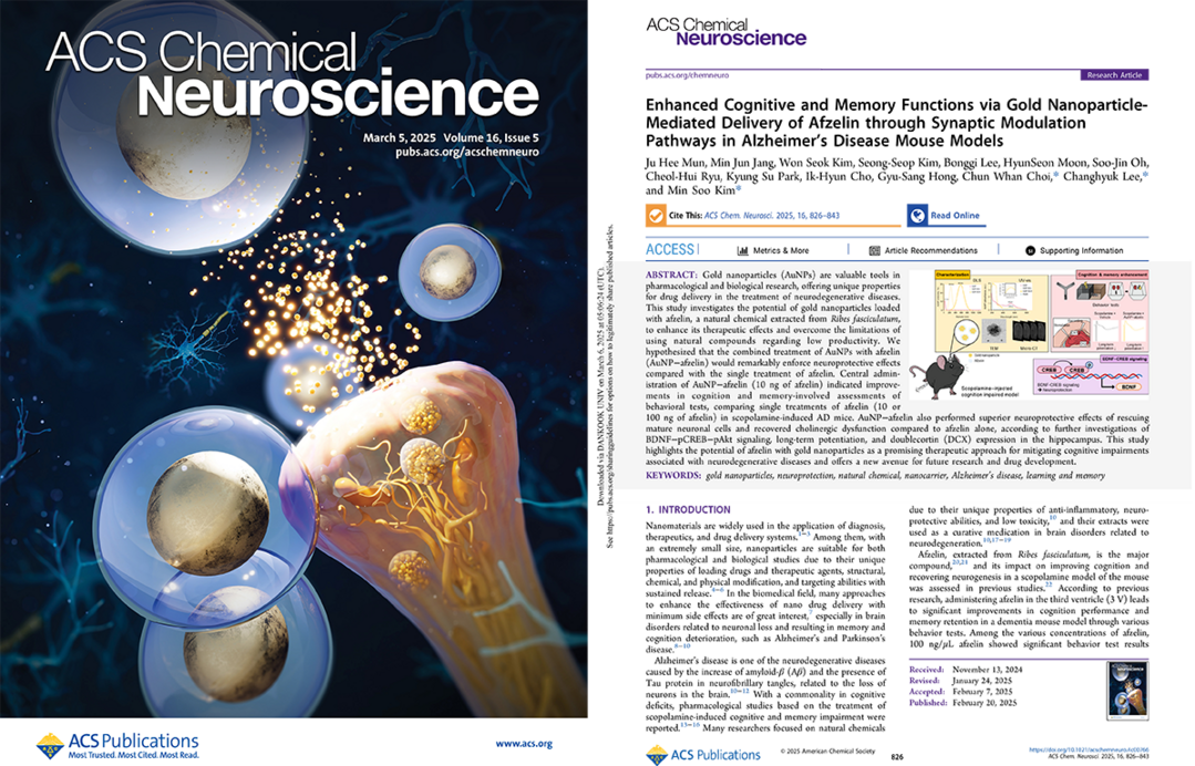 관련 내용은 '금 나노입자로 처리한 아프젤린의 알츠하이머병 인지능 개선효과(Enhanced Cognitive and Memory Functions via Gold Nanoparticle Mediated Delivery of Afzelin through Synaptic Modulation Pathways in Alzheimer's Disease Mouse Models)'라는 논문이다.