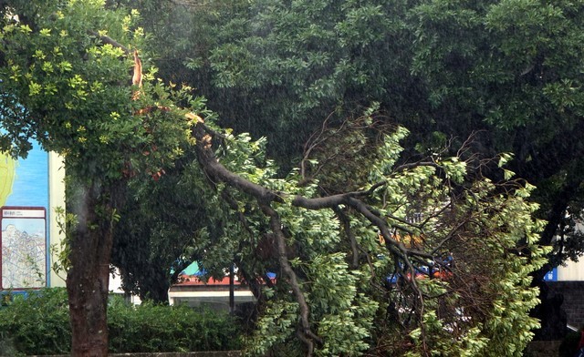 ▲ 22일과 23일 제주도에 근접한 제19호 태풍 '솔릭'이 몰고온 비바람에 제주시 연동 거리에 50여년된 가로수가 꺾여져 있다. [뉴시스]