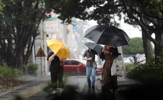 ▲ 제19호 태풍 솔릭이 23일 오전 제주도를 지나면서 시민들이 거센 비바람을 막아내며 출근하고 있다. [뉴시스]