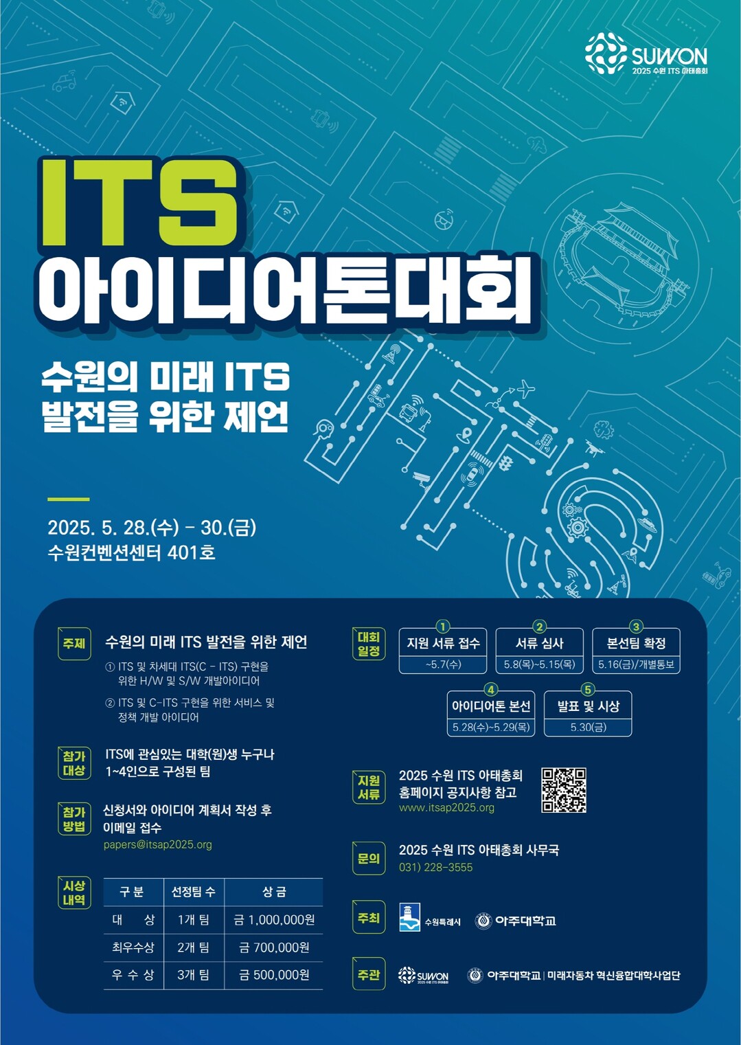 수원시는 아주대학교와 공동 주최하는 '2025 수원 ITS 아이디어톤 대회'가 2025년 수원 IT 아태총회 기간(5월 28일~30일)까지 열린다고 12일 밝혔다.